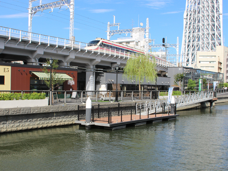 墨田区向島の北十間川沿いに架けられた小梅橋船着場。墨田区と協力しながら、元の構造物の撤去、橋の架設、仕上げまでを私たち東武谷内田建設が一貫して担当しました。両国・日本橋方面へ向かう観光クルーズの発着点として、また東京ミズマチにとけこむ、ほとりの豊かな景観のひとつとして、連日多くの人々でにぎわいを見せています。災害時には防災船着場としても活用され、地域に欠かせない川縁の大事な拠点です。